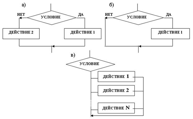 Такая форма организации действий, при которой в зависимости от выполнения или невыполнения некоторого условия совершается либо одна, либо другая последовательность действий. Каждый из путей ведет к общему выходу. Структура ветвление существует в четырёх основных вариантах