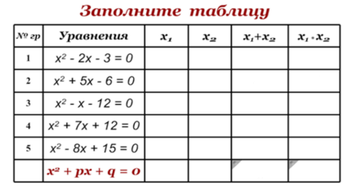 Теорема Виета Сегодня мы познакомимся с теоремой Виета, выполним ряд упражнений на ее закрепление. На страницу урока → Напишите примеры квадратных уравнений указанного вида Уравнения, записанные в стандартном виде Уравнения с нечетным вторым коэффициентом Уравнения с четным вторым коэффициентом Заполните таблицу Ирина Чернышова Опубликовано: 17.12.2013 г. Другие уроки Геометрия 8 класс/Площадь треугольника Кристина Мазуренко Десятичные дроби Резникова Оксана Математика Алгебра_8класс_закрепление Анжела Астанян Ответить Завершить ответВойти для комментирования