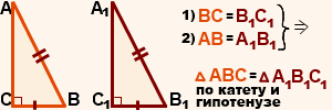 ТеоремаЕсли катет катет и гипотенуза одного прямоугольного треугольника соответственно равны катету и гипотенузе другого прямоугольного треугольника, то такие треугольники равны.